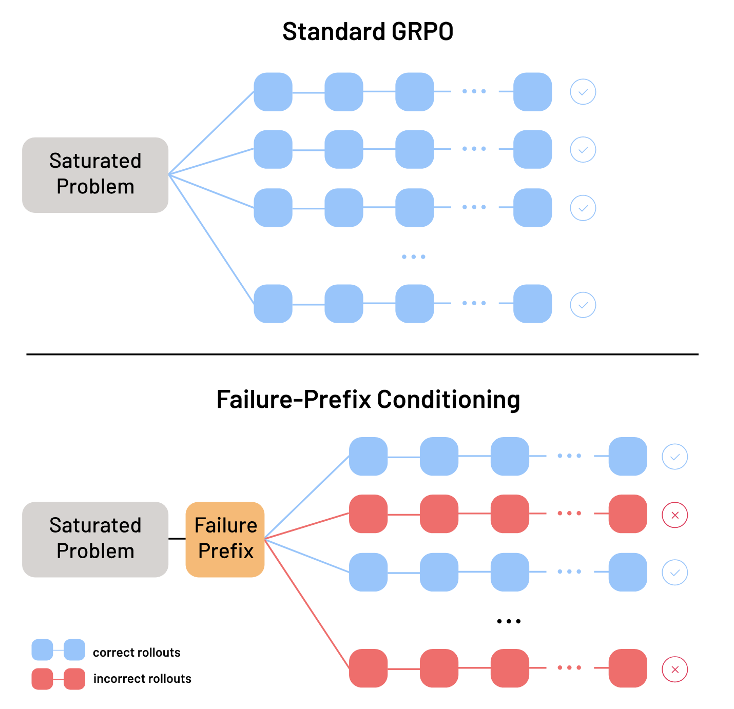 exploration by conditioning training on prefixes from rare incorrect reasoning trajectories,