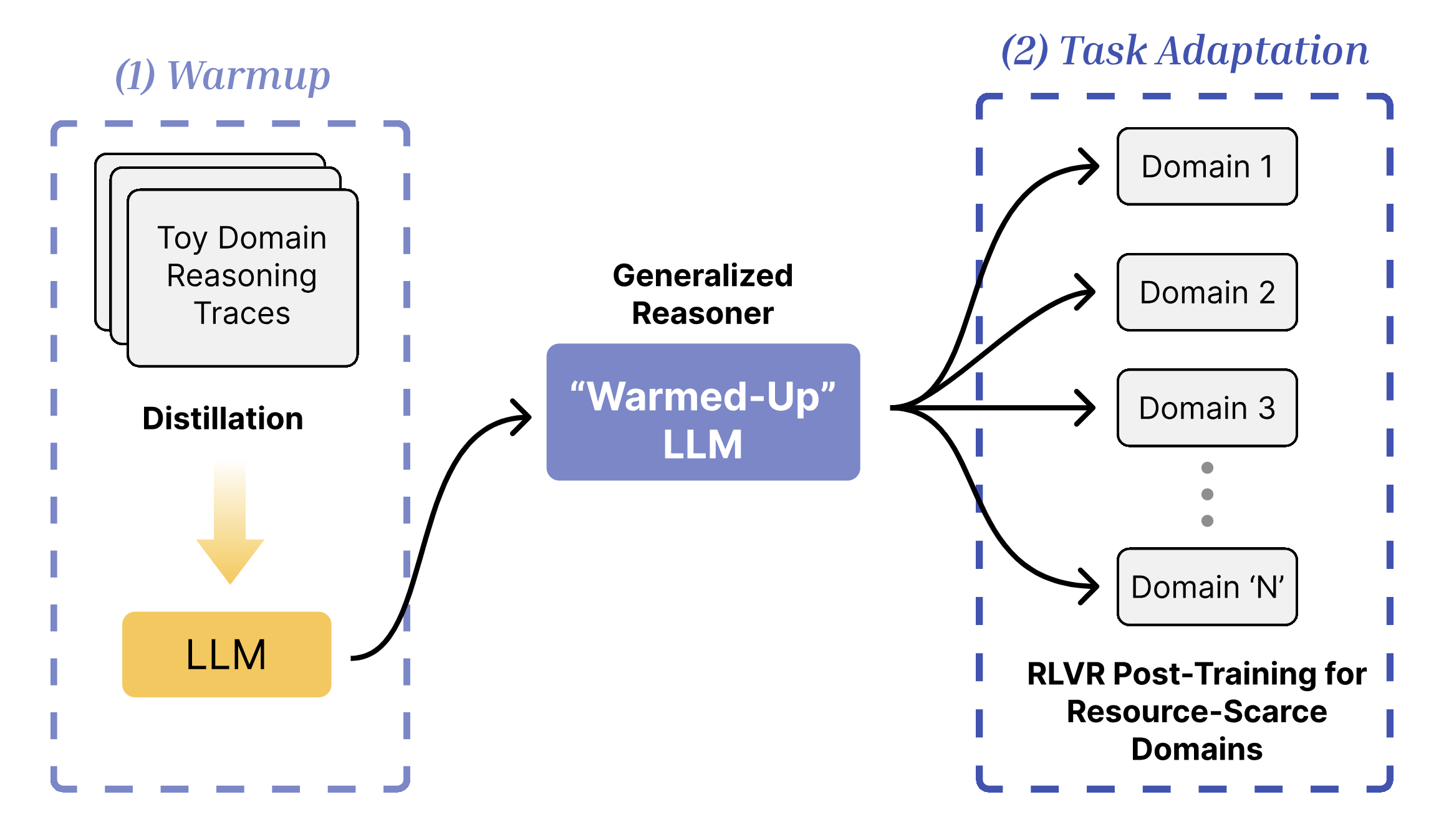We find that distilling (warming up) a LLM with non-domain-specific reasoning traces (like a